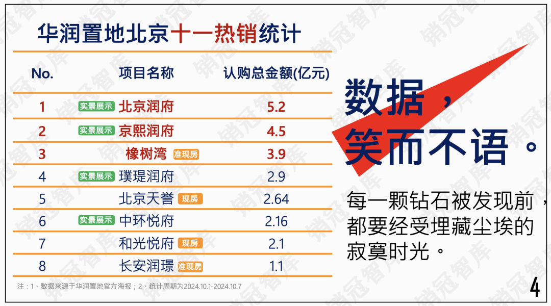 涌向售楼处后,北京买房群众已经用脚投票了 | 市场 来源: 销冠100 2024-10-13 这个假期的一二手房成交,是真的被拉爆了。 都在飘红,爆红到什么程度? 01 这个假期的一二手房成交,是真的被拉爆了。 都在飘红,爆红到什么程度? 表姐粗略统计,十一假期七天,整个北京的二手房实时成交量大约在5400套以上。 什么概念呢?几乎是只用了一周,就完成了以往将近半个月的成交量。 堪比南孚电池,一节更比两节强。 你还能看到,北京二手房实时挂牌量不增反降。目前稳定在13.8万套,并且还在继续下滑。 一个大概率事件是,最近正在买二手房的朋友,可能会遇到要涨价的二手房东。 新房更是拉出一条90度角大阳线。十一假期认购的新房套数,接近2000套,跟9月相比,成交量涨幅超过50%。 而现场的体感是: 国庆假期,表姐一直在北京售楼处感受新政热度,有人准备充足,有人始料不及,案场更是冷热不均,成交出现两极分化也算情理之中。 这波泼天富贵,不是谁都能接住,却有人稳稳拿捏。 这又是为什么? 02 先来看这份榜单: 这是北京主流在售项目十一假期认购TOP情况的统计。你会发现有两个细节: 1.上榜前八榜单楼盘中,华润置地占据半壁江山; 2.套数占比,华润置地一家占比60%。 当我们看到华润置地数据彪悍的时候,可能会认为他们把握政策的能力强,营销力也很猛。 不过,你有没有注意到另外一组数据: 3.冠军和亚军也花落华润; 都卖得好的时候,表姐会特别留意冠军是谁。好到冠军程度,就不只是营销力和抓机会的问题了。 而背后的东西,数据端里看不到,其实才重要。 可能会有人说两条: 1.有超强的实景展示区; 2.已经进入现房或准现房实景阶段。 果真是这样吗? 也对,也不完全是。 比如假期认购套数冠军京熙润府和亚军北京润府只是实景展示,橡树湾却是准现房。 前者是实景展示力,后者是产品力最后一公里的交付力,有共同点,也有区别。 为什么客户还是蜂拥而至,这就由不得让人再多想想了。 很多时候,秘密在现场,答案也在现场。 03 国庆期间,表姐全北京度假式看盘。 看的第一个项目,就是位于东三环的北京天誉。 虽然看过很多次,每一次都会用「啧啧啧」来感叹。这一次也不例外。只是身旁有了更多的「啧啧啧」,很多一起看房客户也都发出这样感叹。 ☉北京天誉实景 要知道,这可是实景实拍。画面中呈现的凉亭、拱桥、顽石与松涛,水系和硬质景观结合这么好,更是将宋代的园林书香气都移植过来。 再来看游园步道, ☉北京天誉实景 步道见过很多,以前感觉都差不多。但是,这里的步道却很独特,大块整石,太白青,让人仿佛有种漫步峡谷的真实体感。 而这样的特别体验感,不只是一处,还有这里, ☉北京天誉实景 就是东三环很有名气「金线豪宅」,不止给建筑镶上了暖色调的金线,还复刻了太空舱式的大面积弧线。 还有颇具禅意的曲水, ☉北京天誉实景 还有不经意间容易忽略的枫箱, ☉北京天誉实景 再和华润置地其它楼盘的实景比较着看,你会发现都不一样,不是标准化。 甚至每个楼盘的实景故事线不一样,主题也不一样,所以游园的体验感也就不一样。 再比如橡树湾, ☉西红门橡树湾文园实景 经典的红砖长廊当然不能少,熟悉的红砖、拱门,搭配生命力旺盛的大树,大学的亲切感扑面而来。 ☉西红门橡树湾文园实景 表姐曾经问过华润置地小伙伴,为什么每个项目都很特别? 他反而将问题抛给了表姐:不同的地段,当然要有差异化的对待,怎么可能复制和走标准化打法呢? 比如,西红门橡树湾也配备了高档会所,甚至整个大盘一口气规划了三个会所。 ☉西红门橡树湾文园会所实景 看到这里,你说华润置地卖得好,真的很难单纯用营销力强来解释。 说它产品力强,似乎也不精准到里子, 所以,表姐感觉华润置地更神秘了…… 04 越看越不解和困惑,表姐到了第三个项目和光悦府,和望京牵手的平层大宅。 你会发现,和光悦府对产品细节的追求,已经很极致到艺术。比如刚入社区大门的雕像, 还有中心大花园的星空游廊, ☉和光悦府实景 这真不是一句产品力很强就能概括。 仔仔细细地看,认认真真地想,表姐突然发现华润置地正在努力做一件事—— 体验感, 而且是最完美的体验感,每一处微小细节也不放过。 在刚刚过去的9月份,轻松拿下朝阳网签金额TOP1,表姐也就不意外了。 和光悦府实景示范区刚出来时,表姐曾经约软装的小伙伴聊天,看过和光悦府的手稿。 都是数十轮方案的调整,翻来覆去地改图,那绝对不只是不计成本的投入,更是费时间,废精力、废心神。 所以,回过来再问一句,华润置地的神秘感是什么? 超强的实景体验感吗? 也是,也不是。 超强实景体验感只是结果。结果背后的东西,又是什么? 在快周转时代,华润置地对产品的投入,对产品细节的苛求,已经不仅是追求表面上的体验感了。 背后看不见的东西,表姐叫它 情怀。 05 为什么这么说? 一起来看看华润置地的园林IP: 达尔文营地。 这次全北京卖得超火的两个项目,京熙润府与北京润府,都设计了达尔文营地。 其中,北京润府的达尔文营地,已经实现了落地呈现。 ☉北京润府达尔文营地实景 一件事做一年两年,可能看不到明显效果。 如果是持续性的创新,而且是全国推广,没有情怀真的很难坚持下来。比如,达尔文营地。 除了情怀,你还能想到更精准的词汇吗? 国庆假期间,表姐也是头一回看到实景的达尔文营地