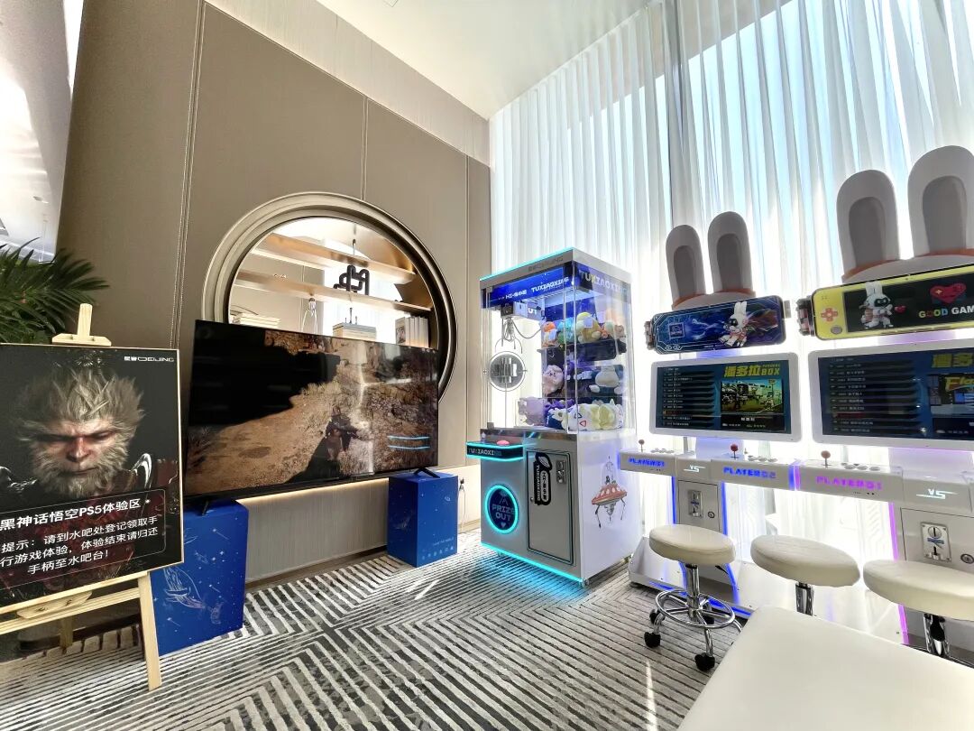 比如,售楼处的游戏区域有抓娃娃机、街机游戏、甚至还有黑神话游戏体验,以及炒酸奶、烤肠,爱心区域猫咪领养活动等等。