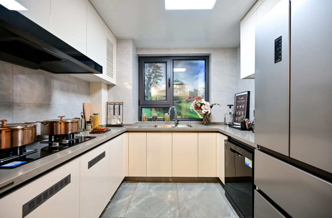 再比如在精装上做足文章,升级电视背景墙的岩板、卧室的门、主卧背景墙的饰板,加送洗碗机,材质的纹理和空间融合度非常高。