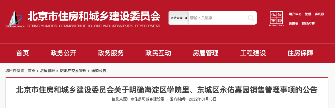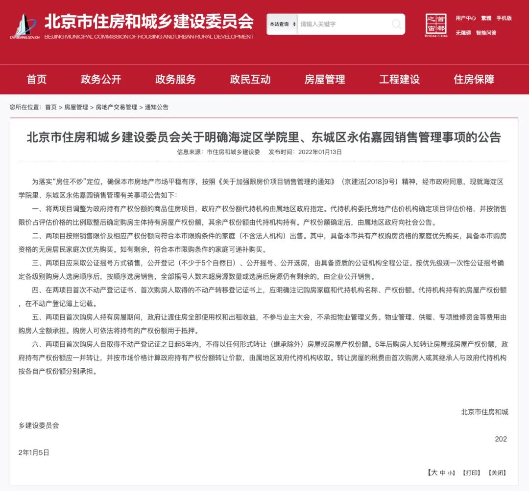 北京市住房和城乡建设委员会关于明确海淀区学院里、东城区永佑嘉园销售管理事项的公告