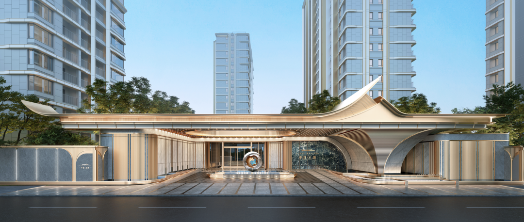 并非完全对称,而是通过米白色金属线条的设计,香槟金线条的勾勒,巧妙的在立面上做出了一种灵动的节奏感。